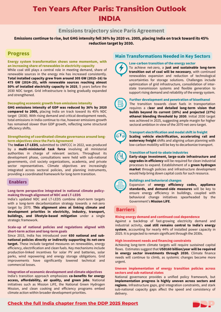 The DDP country one-pagers are a snapshot of full chapters from the 2025 report “A Decade of National Climate Action: Stocktake And The Road Ahead” This one-pager shows how India’s national pathways are shaping the transition to net zero