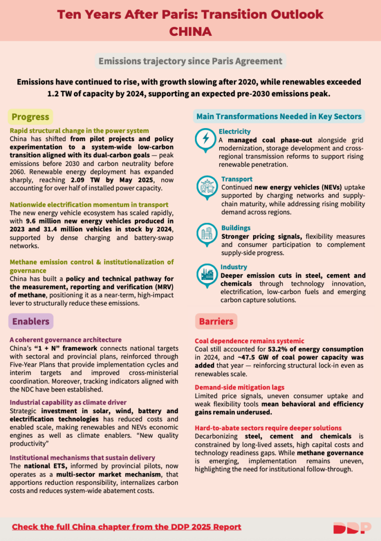 The DDP country one-pagers are a snapshot of full chapters from the 2025 report “A Decade of National Climate Action: Stocktake And The Road Ahead” This one-pager shows how China’s national pathways are shaping the transition to net zero